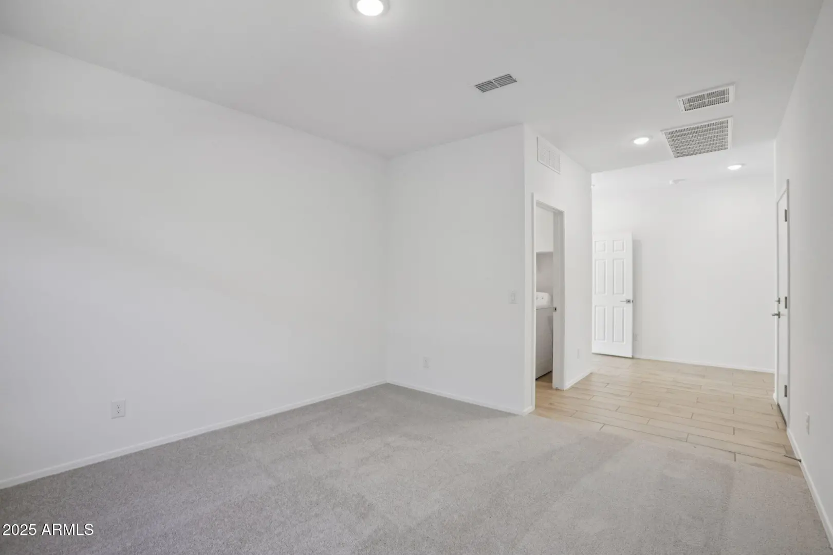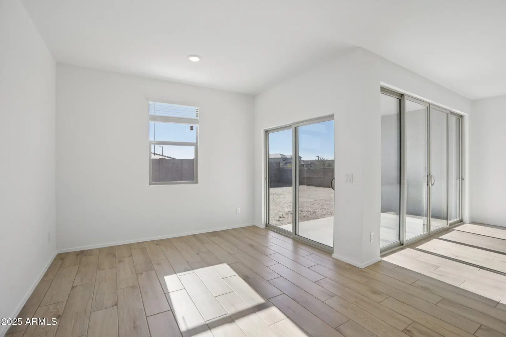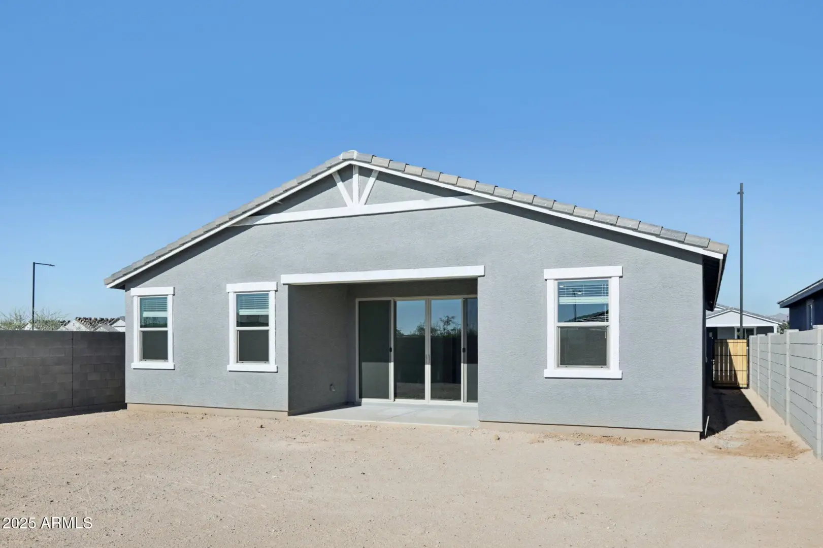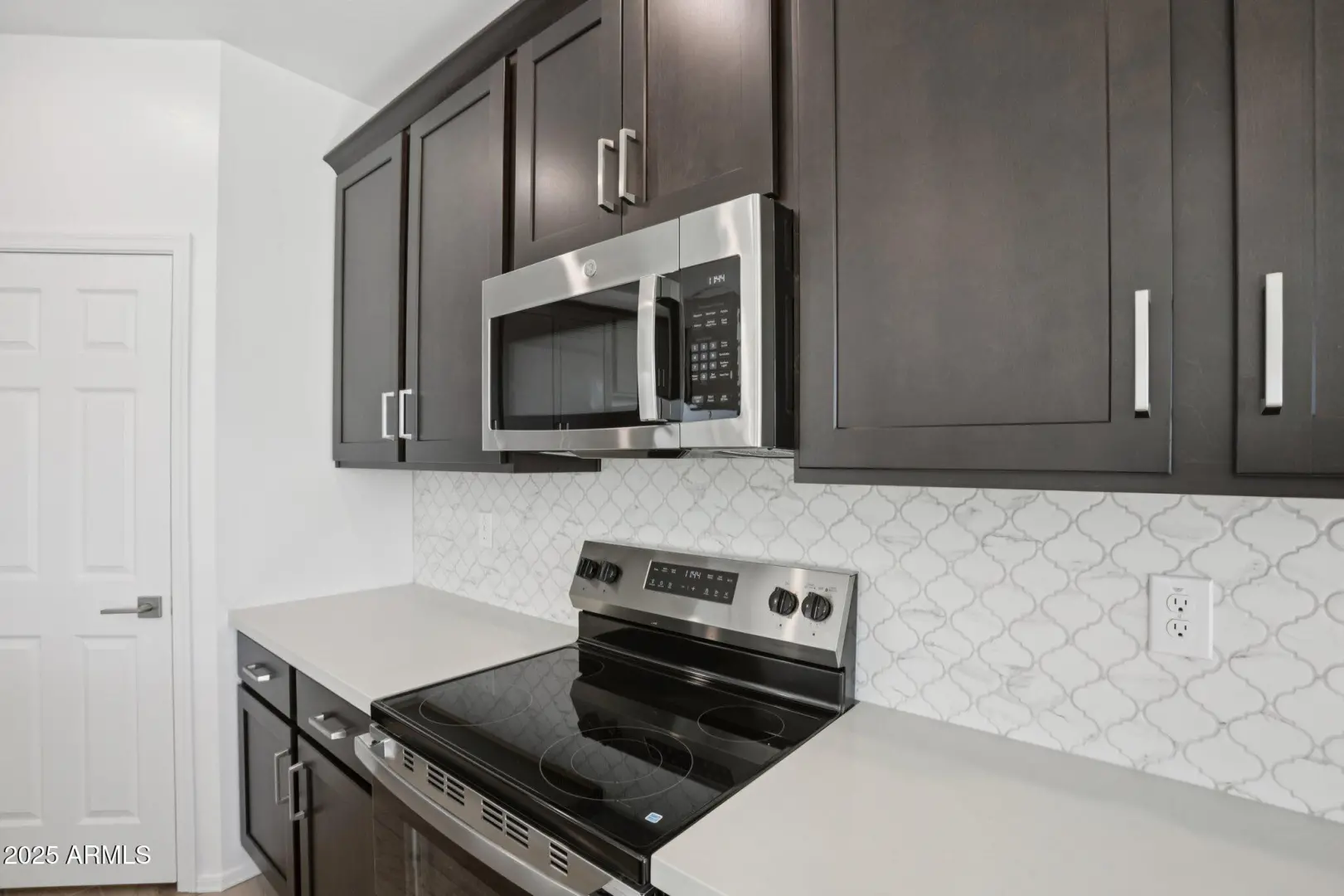 Step into refined living with this brand-new 1,953 sq. ft. residence, thoughtfully designed to blend modern style with everyday comfort. Offering 3 spacious bedrooms, 2.5 baths, and a versatile den perfect for a home office or flex space, this home embodies both functionality and elegance. The Roosevelt floor plan showcases elevated finishes throughout, including 42'' espresso cabinetry, a designer tile backsplash, and an oversized quartz island that anchors the kitchen. Stainless steel appliances, along with the refrigerator, washer, and dryer, are all included for effortless move-in convenience. Soaring 9-foot ceilings and an open-concept layout create an airy, inviting atmosphere, complemented by 8x36 wood-look tile that brings warmth and continuity through the main living