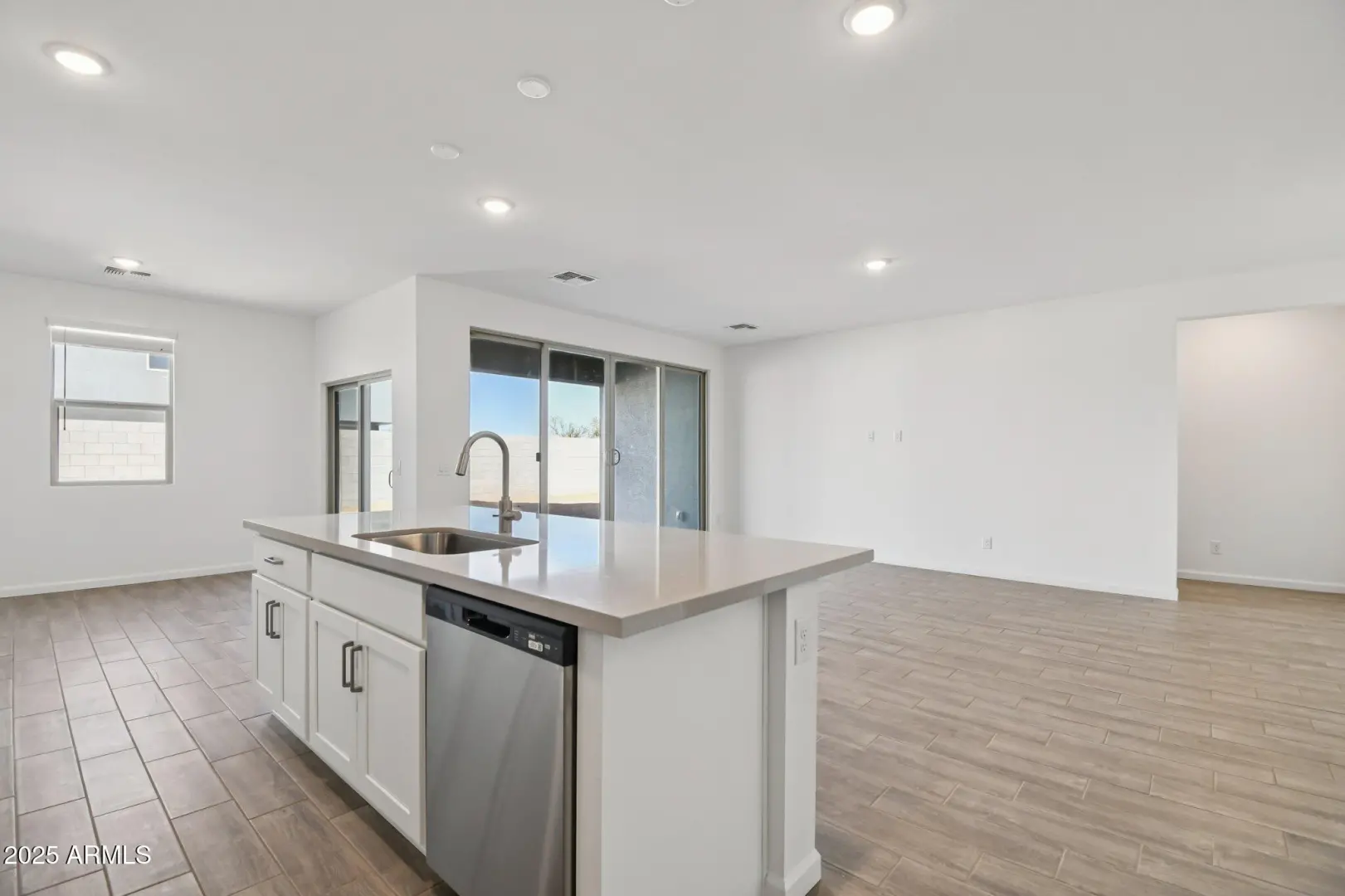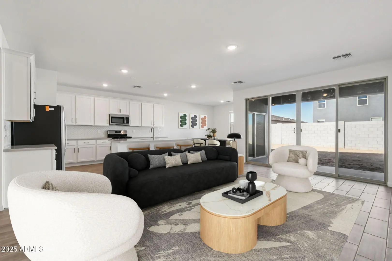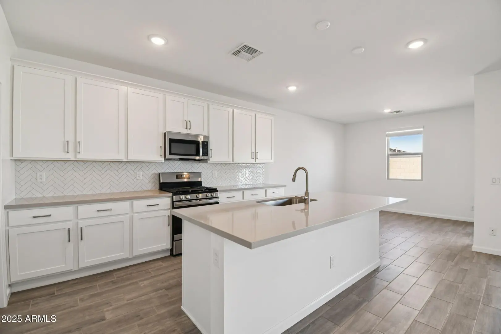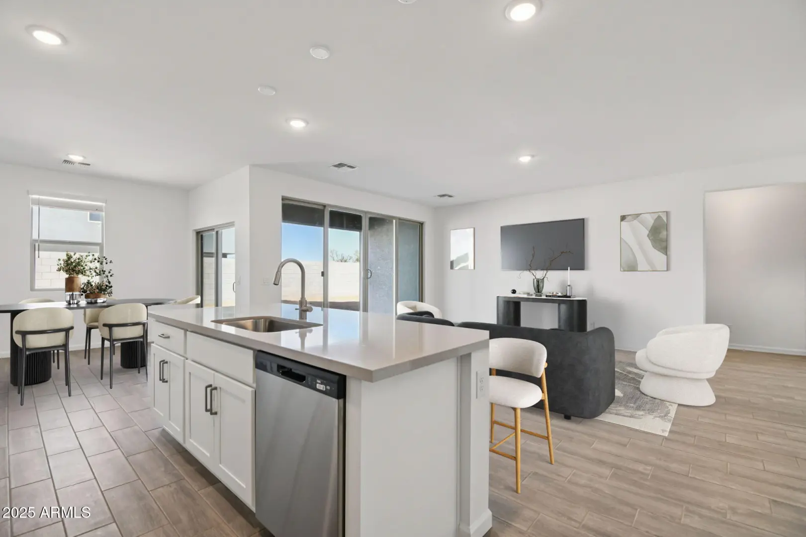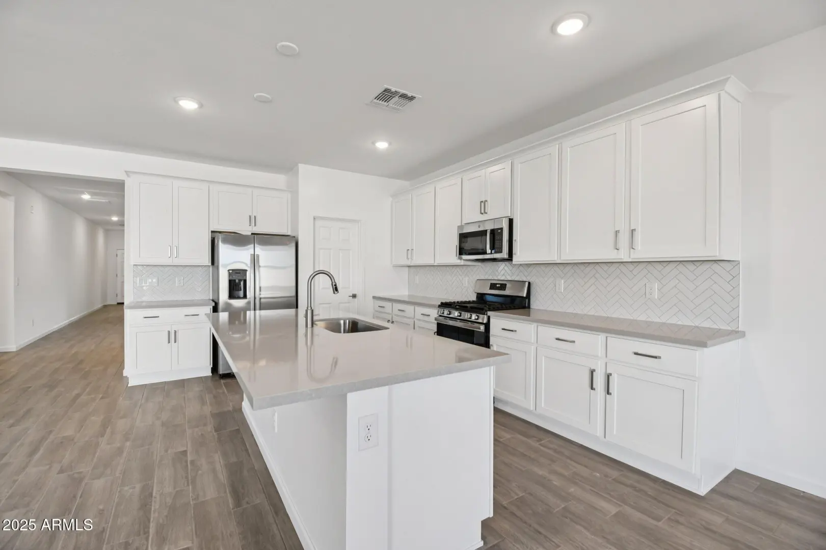 Welcome to your Dream Single-Story Super Garage Home! This Ruby Super Garage brand-new construction home plan boasts charming farmhouse architecture in the front, blending seamlessly with its surroundings. With 2,173 square feet of designer-curated living space, this gem offers a place of casual comforts and airy style. The spacious open-concept floor plan has three bedrooms, a large den, and 2.5 bathrooms. You'll love the magnificent four-panel center siding glass door, bathing the area in sunlight, and the 7 x 22 Plank Tile wood-look floors throughout the main living areas, offering elegance and easy maintenance. A chef's delight, the kitchen delivers in every way with Ivory White Quartz countertops, a stainless steel single bowl under-mount sink, a stainless steel Gas range,
