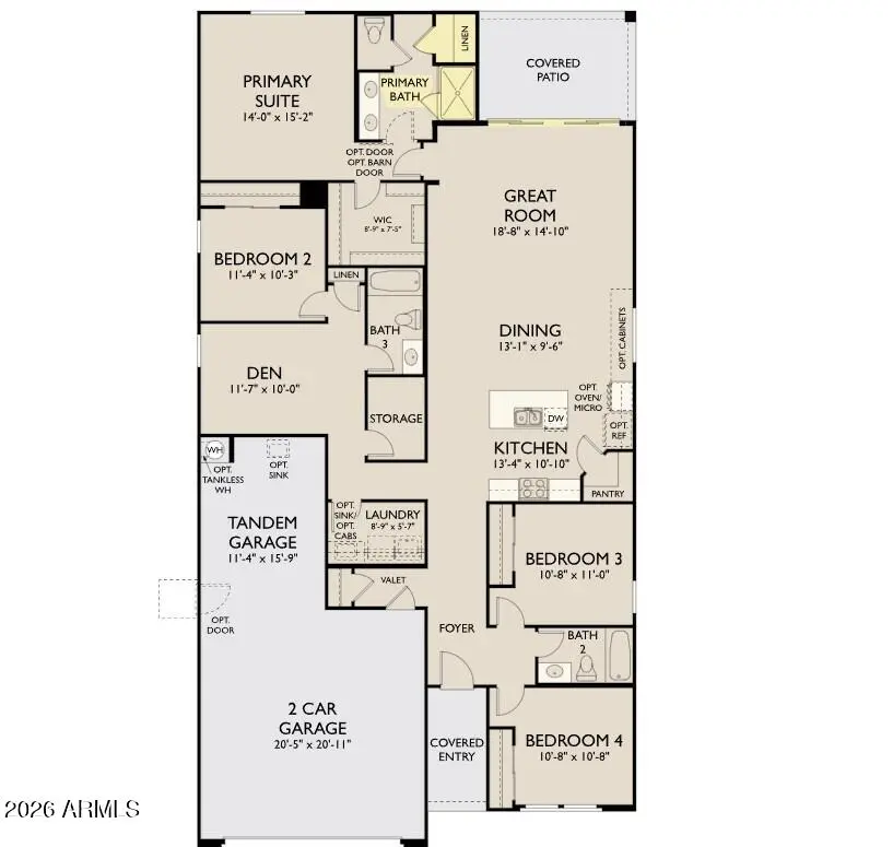 Introducing the Sage Plan, a brand new luxury Studio Collection plan at Aloravita--where refined desert living is elevated with a distinctive Harmony designer touch and showcased in a stunning farmhouse elevation. This beautifully appointed single-story home blends crisp finishes with warm, grounding tones--creating a space that feels both elevated and effortlessly inviting. Featuring 4 bedrooms, 3 baths, a private den, and a 3-car tandem garage with a garage service door, the Sage offers exceptional versatility wrapped in sophisticated design. The farmhouse exterior delivers timeless curb appeal with clean lines and welcoming character, enhanced by a pavered entry and EV outlet. Inside, the expansive great room serves as the heart of the home, where a dramatic 4-panel sliding glass doo