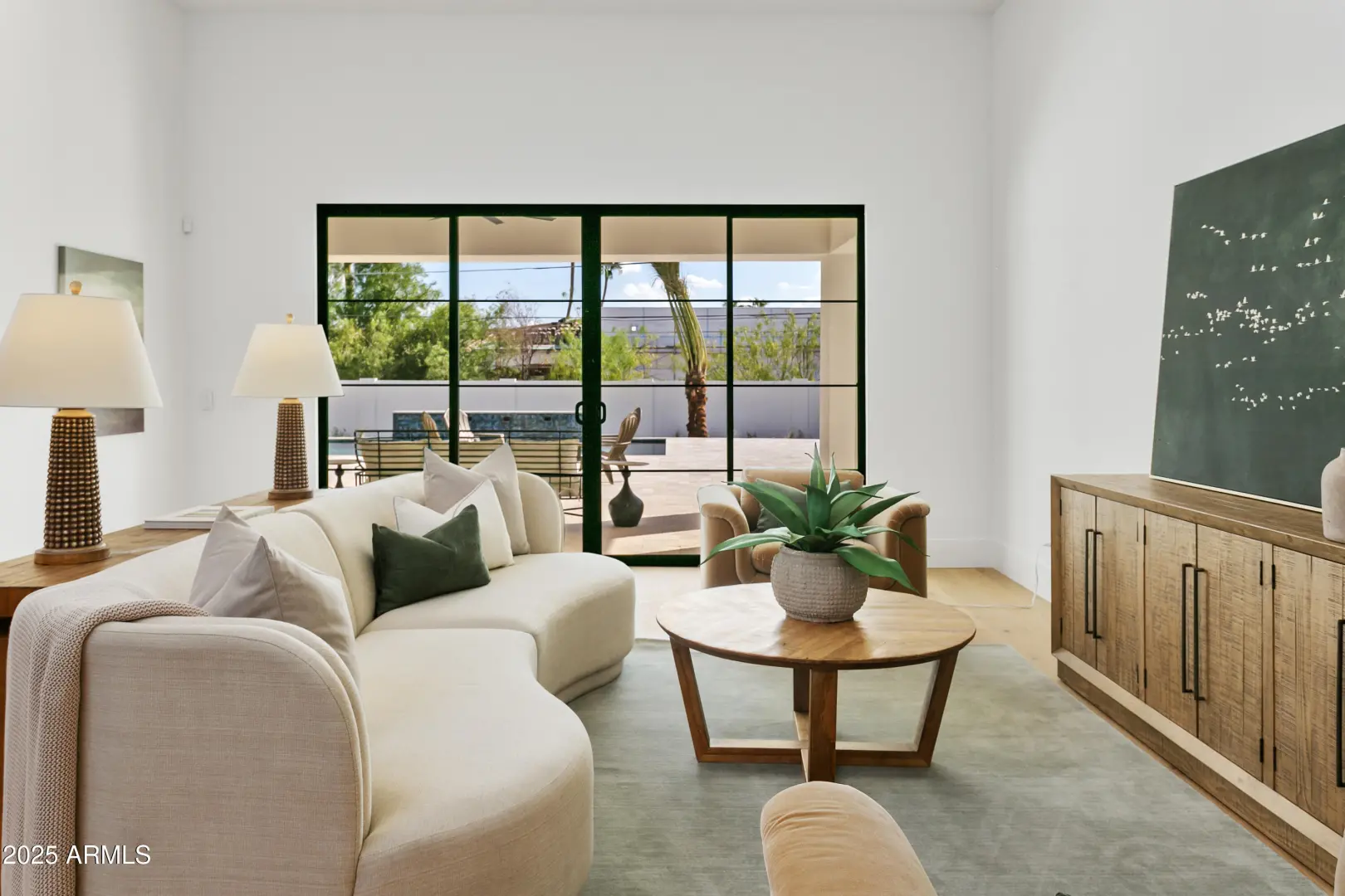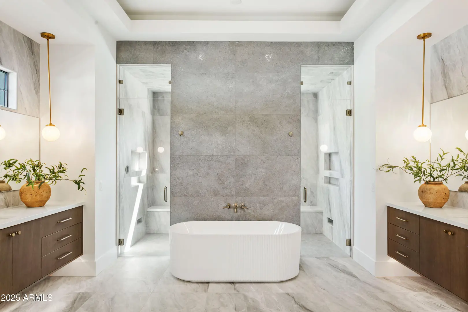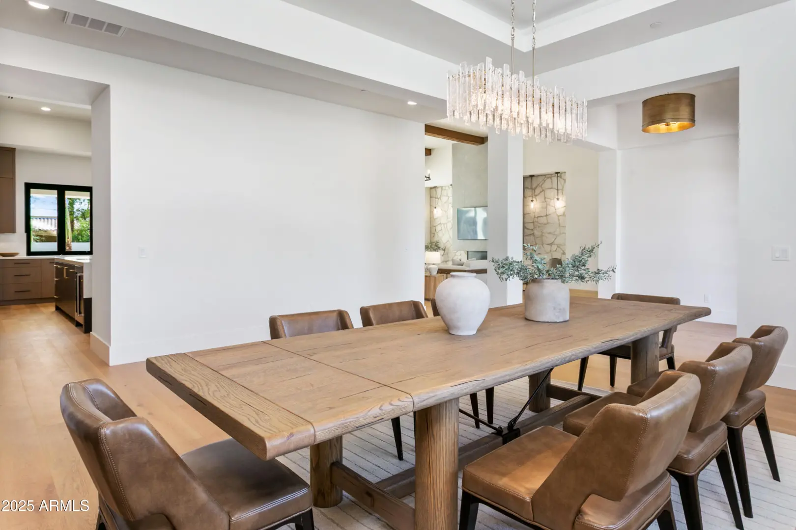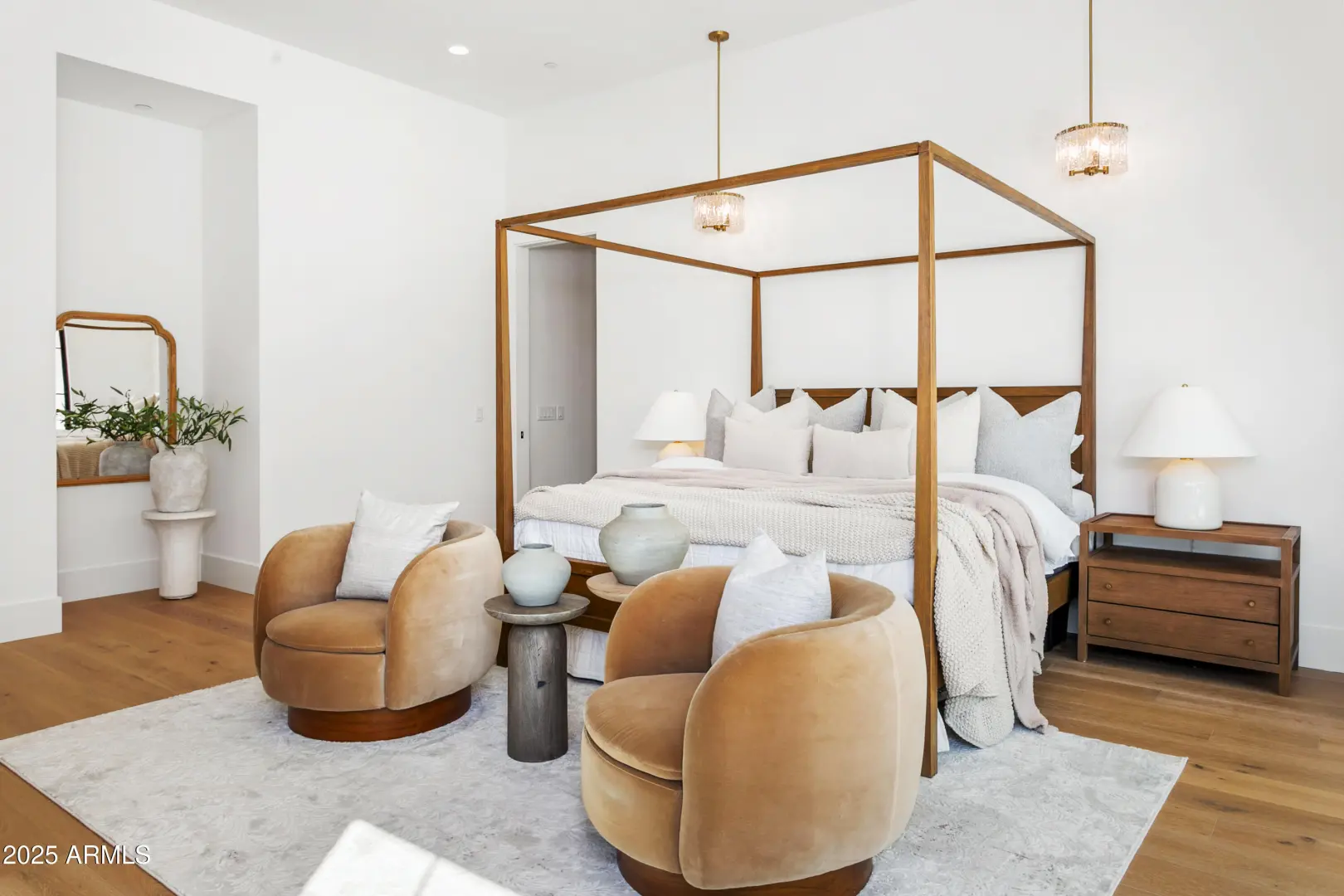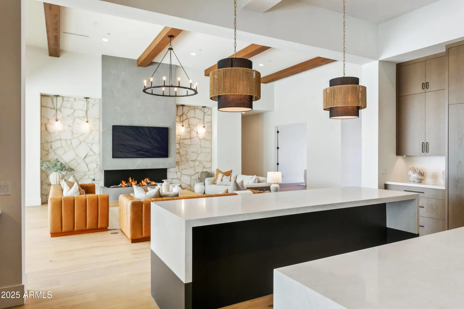 Traditional and modern collide in the newest luxury residence built by Richter Homes. Located on a full acre lot in a prime Scottsdale location, this home boasts 6,000sf with 5 beds, 5.5 baths, plus a game room. Thoughtfully designed layout and bespoke finishes - phenomenal space for hosting and comfortable living. Great room features 14' ceilings, modern fireplace, and retractable doors leading to the pool. Chef's kitchen with 60'' Wolf range, integrated Subzero fridge/freezer, flat panel rift oak cabinets, and accordion passthrough window to the outdoor kitchen. Luxurious primary suite with a fireplace, steam shower, custom closet and hidden safe room. Large secondary bedrooms, including a junior master suite. Game room features a full wet bar and bathroom that connects to the outside.